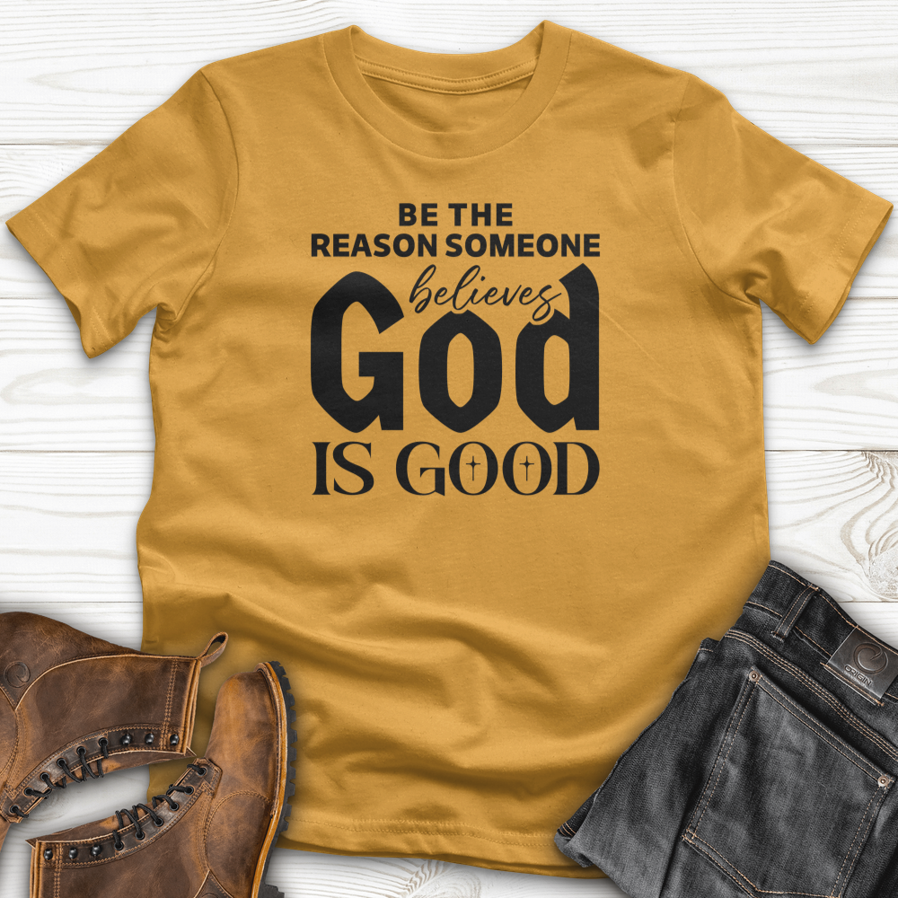 Be The Reason Someone Believes God Is Good T-Shirt Wear your faith with purpose in this meaningful tee that celebrates the power of kindness and compassion. Designed for those who believe their actions speak louder than words, this shirt serves as a daily reminder to live out your values and inspire others through genuine goodness. Perfect for church gatherings, faith-based events, or everyday wear, it's a conversation starter that encourages reflection on how we impact those around us. Comfortable, quality-made, and thoughtfully crafted for believers who want to make a difference.