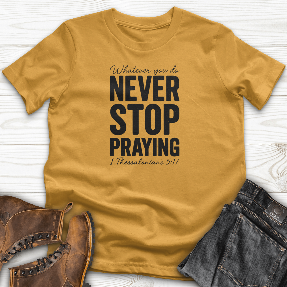 Embrace a message of steadfast faith with the Whatever You Do Never Stop Praying T-Shirt. Crafted for comfort and style, this garment serves as a subtle yet powerful reminder to maintain your spiritual focus through every moment. Its refined design makes it suitable for both casual wear and meaningful occasions, encouraging perseverance and hope in your daily life.