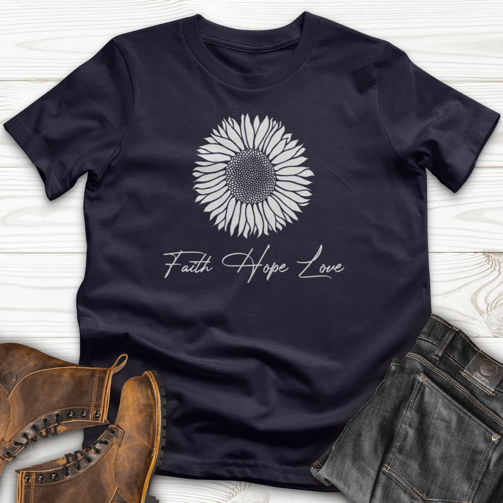 Embrace positivity with the Faith Hope Love Rustic Sunflower T-Shirt. Featuring a heartfelt design that combines faith, hope, and love with a charming rustic sunflower, this comfortable tee encourages strength and optimism every day. Perfect for sharing inspiration and warmth wherever you go.