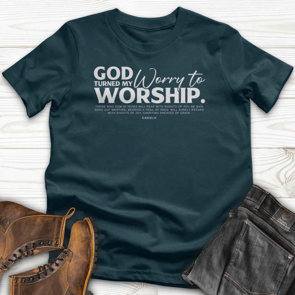 God Turned My Worry to Worship T-Shirt Wear your faith with purpose in this meaningful tee that celebrates spiritual transformation. Perfect for those who've experienced the peace that comes from surrendering anxiety to a higher power, this shirt serves as a daily reminder of your journey from doubt to devotion. Crafted for comfort and style, it's an ideal way to share your testimony and inspire others on their own path of faith. Whether worn casually or as part of your spiritual community gatherings, this tee speaks volumes about resilience and trust.