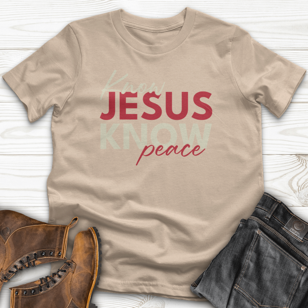 Know Jesus Know Peace T-Shirt Wear your faith with purpose in this meaningful graphic tee. Featuring an inspiring message that speaks to spiritual conviction and inner calm, this shirt serves as a gentle reminder of the peace that comes through faith. Crafted from comfortable, quality fabric, it's perfect for everyday wear, church gatherings, or sharing your beliefs with others. A versatile piece that combines style with substance, allowing you to express what matters most to you.