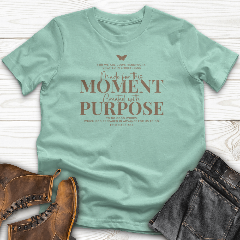 Made for This Moment T-shirt Wear your confidence with this empowering tee designed to remind you that you're exactly where you need to be. Crafted for comfort and durability, this classic t-shirt features a meaningful message that resonates with anyone facing new challenges or celebrating personal victories. Perfect for everyday wear, workouts, or simply those days when you need an extra boost of encouragement. Let this shirt be your silent cheerleader, supporting you through every chapter of your journey.
