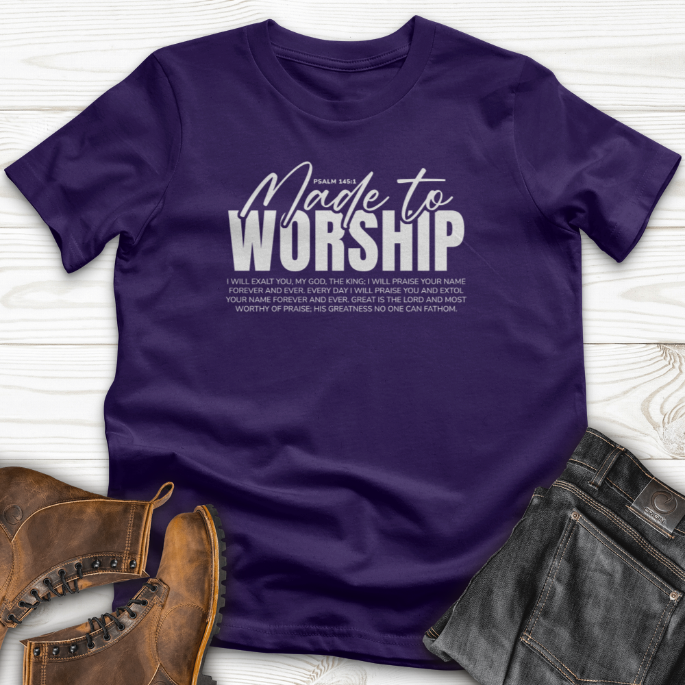 Made to Worship T-shirt Wear your faith with pride in this meaningful tee designed for those who live their beliefs daily. Crafted from soft, comfortable fabric, this shirt serves as a gentle reminder of your spiritual purpose and values. Perfect for casual wear, worship gatherings, or everyday inspiration, it's a simple yet powerful way to express what matters most to you. Whether you're sharing your journey with others or strengthening your own conviction, this tee becomes more than clothing—it's a statement of devotion and a conversation starter about what truly fulfills your soul.
