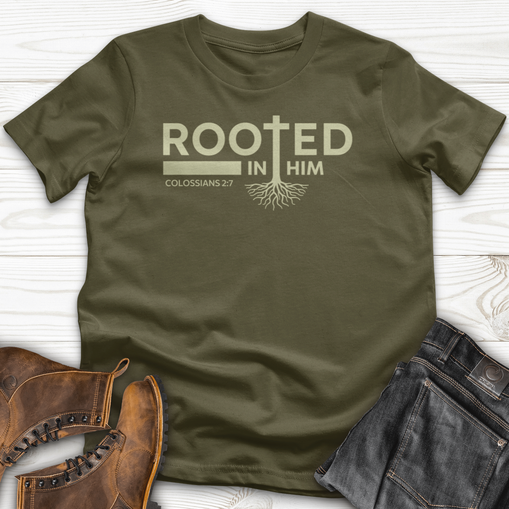 Rooted in Him T-shirt Strengthen your faith with every wear. This comfortable, quality tee serves as a daily reminder of your spiritual foundation and connection to what matters most. Perfect for casual days, church gatherings, or whenever you need that gentle encouragement. Crafted for all-day comfort, it's a meaningful way to express your beliefs while staying relaxed and confident in your own skin.