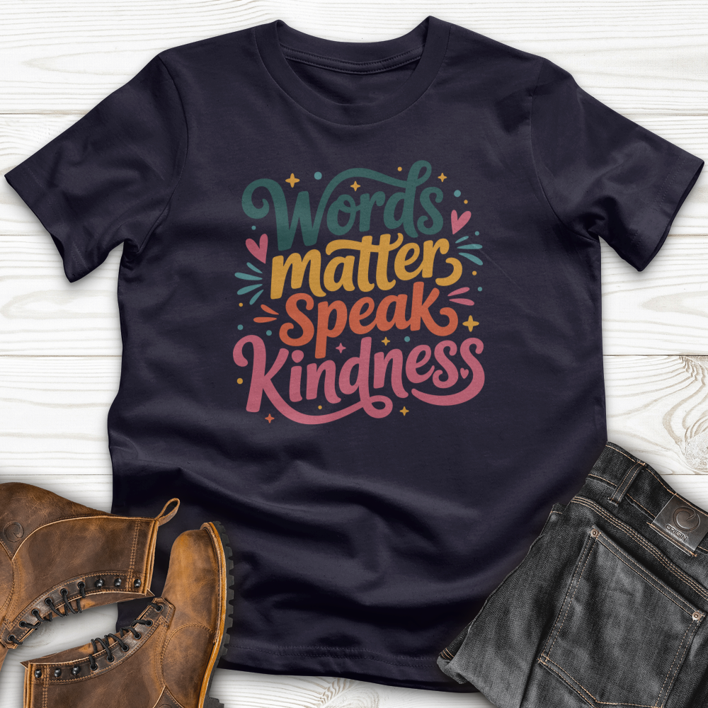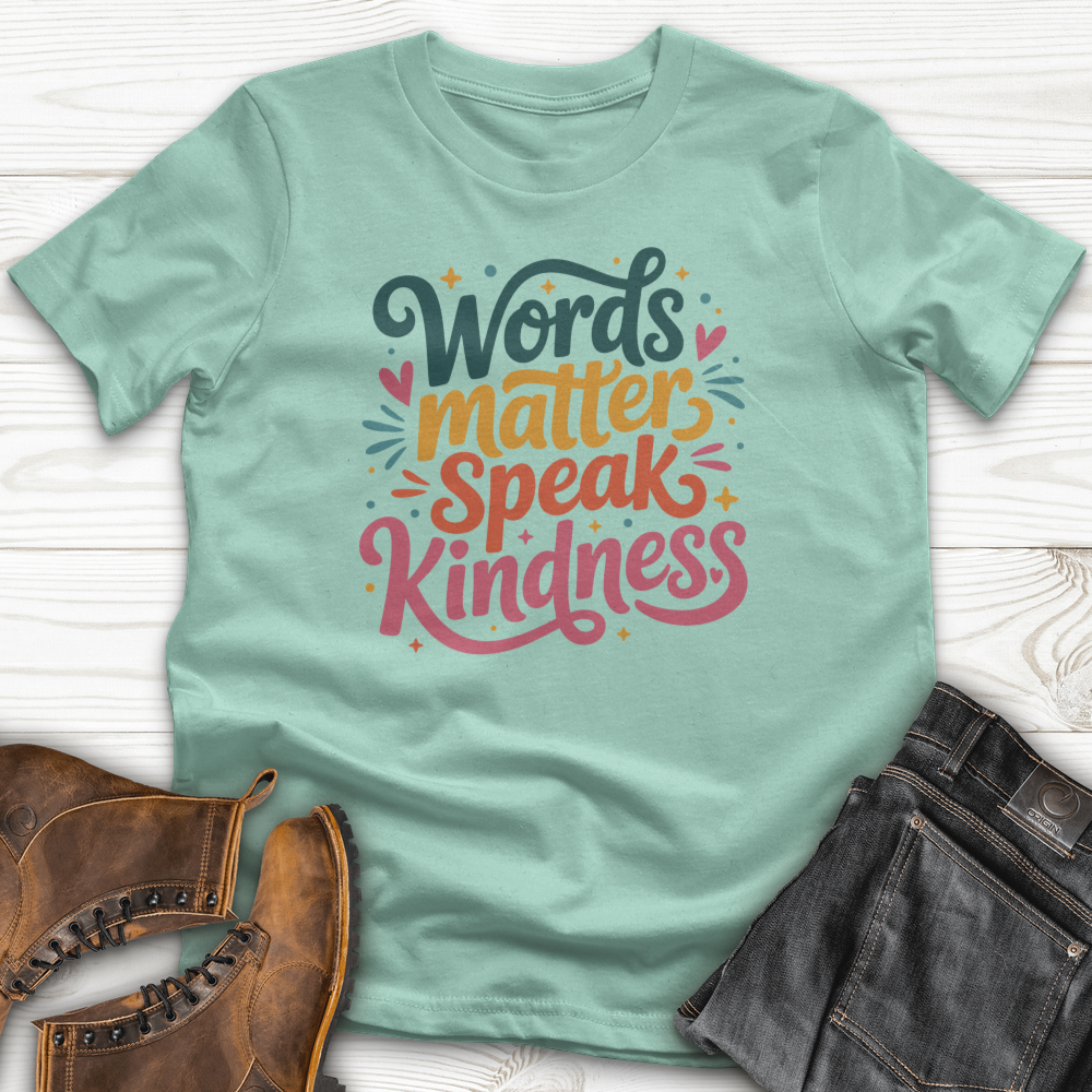 Words Matter Speak Kindness T-Shirt Wear your values with this meaningful tee that celebrates the power of compassionate communication. Crafted from soft, comfortable fabric, it's perfect for anyone committed to spreading positivity and encouraging kindness in their daily interactions. Whether you're making a personal statement or inspiring others, this shirt serves as a gentle reminder that our words have the ability to uplift, heal, and transform. A wardrobe essential for those who believe in the impact of thoughtful speech.
