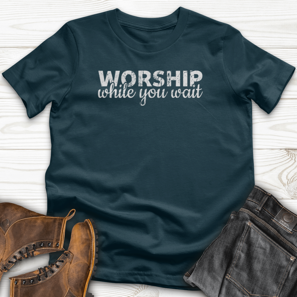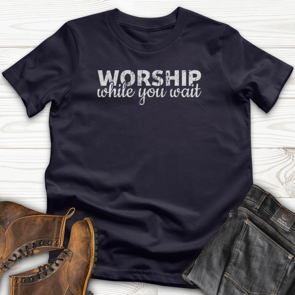 Worship While You Wait T-Shirt Find strength in every moment with this inspiring tee designed for those who trust in their journey. Crafted from soft, breathable fabric, it's perfect for daily wear whether you're at home, at the gym, or out with friends. The meaningful message serves as a gentle reminder to stay faithful and positive during life's transitions. Comfortable, durable, and uplifting—wear your faith with pride.